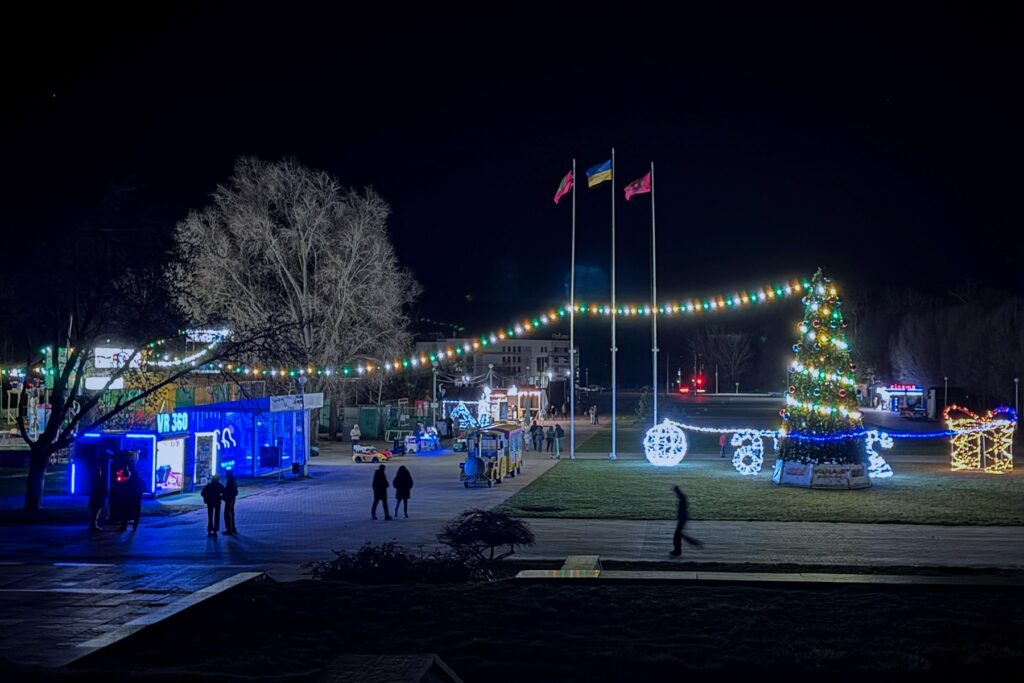 クリスマスのイルミネーションが灯る通りを歩く人々。2025年12月13日、ウクライナ南部ザポリージャ。(Darya Nazarova/AFP via Getty Images)