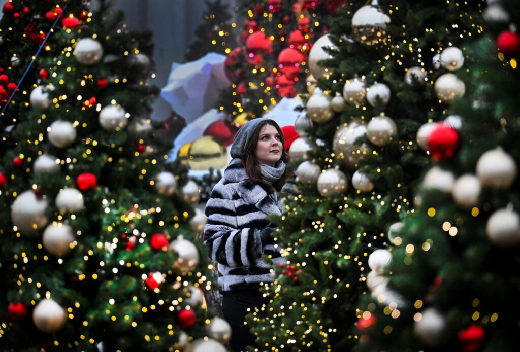 クリスマスの装飾を楽しむ女性。2025年12月18日、ロシア・モスクワ中心部。(Alexander Nemenov/AFP via Getty Images)