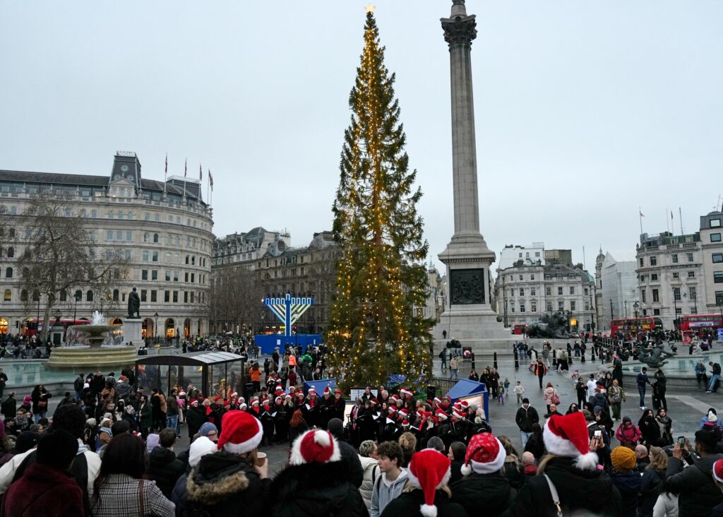 クリスマスツリーの下で聖歌を歌う人々。2025年12月21日、英ロンドン中心部トラファルガー広場。(Carlos Jasso/AFP via Getty Images)