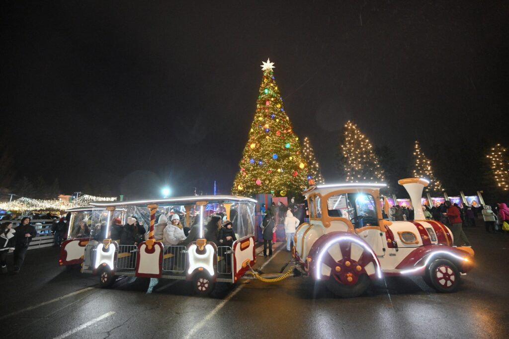 クリスマス博覧会の会場を走る観光列車。2025年12月21日、ウクライナ・キーウのウクライナ国立展示センター。(Sergei Supinsky/AFP via Getty Images)