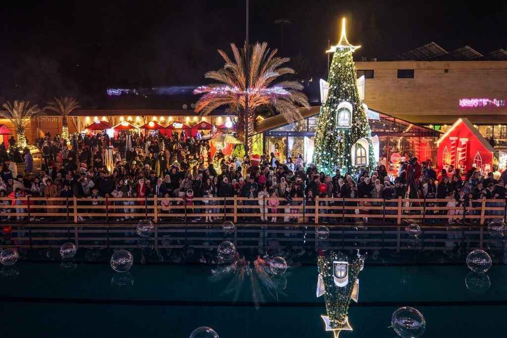プール周辺に設けられたクリスマスマーケットを歩く人々。2025年12月22日、シリア・ダマスカス。(Bakr ALkasem/AFP via Getty Images)