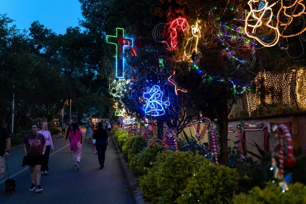 2025年12月23日、聖誕節を前に、南アフリカのヨハネスブルグ近郊にあるブライアンストン地区の並木道を、クリスマス装飾の下で歩く人々。(Wikus de Wet/AFP via Getty Images)