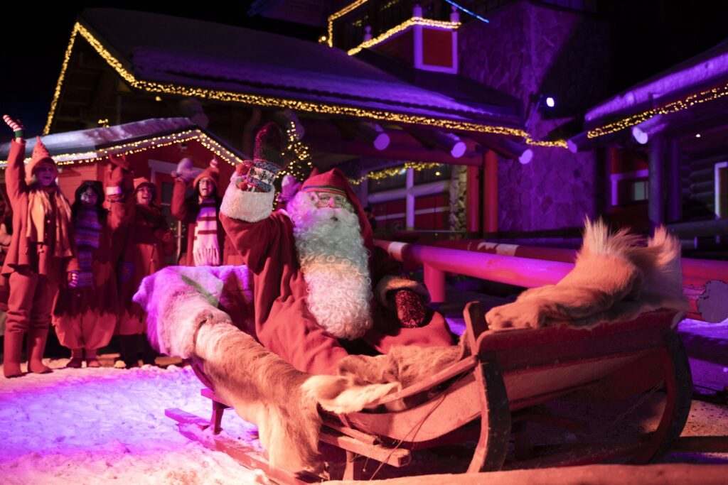サンタクロースが旅立つ様子。2025年12月23日、フィンランド・ラップランド地方のサンタクロース村。(Laura Haapamäki/Lehtikuva/AFP via Getty Images)