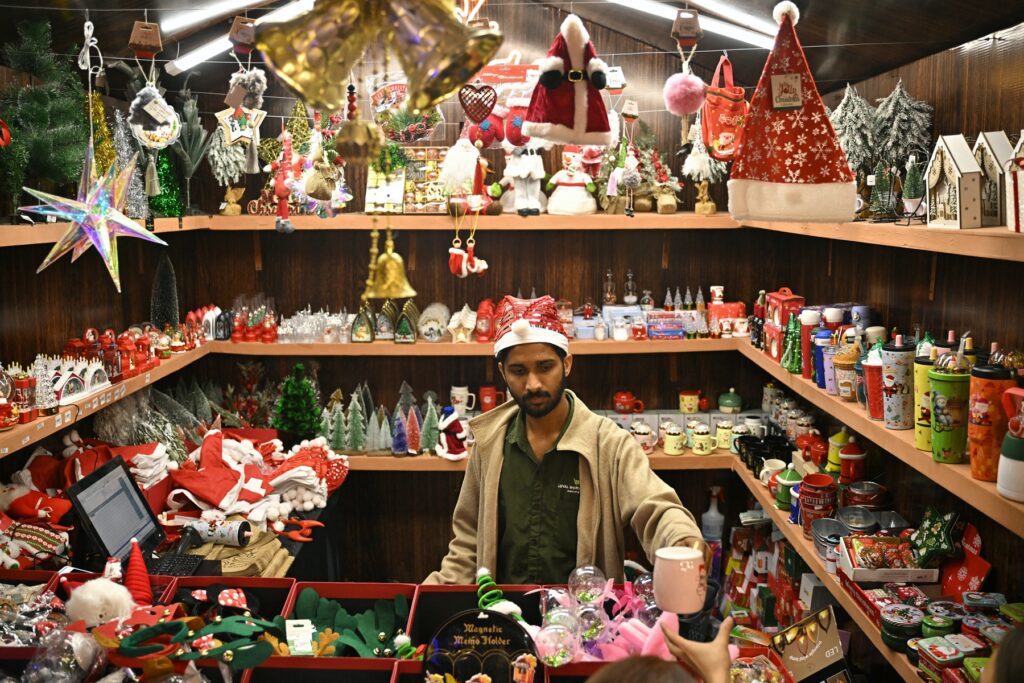 クリスマスマーケットで装飾品を売る男性。2025年12月23日、インド・ベンガルールのフェニックス・マーケットシティ。(Idrees Mohammed/AFP via Getty Images)