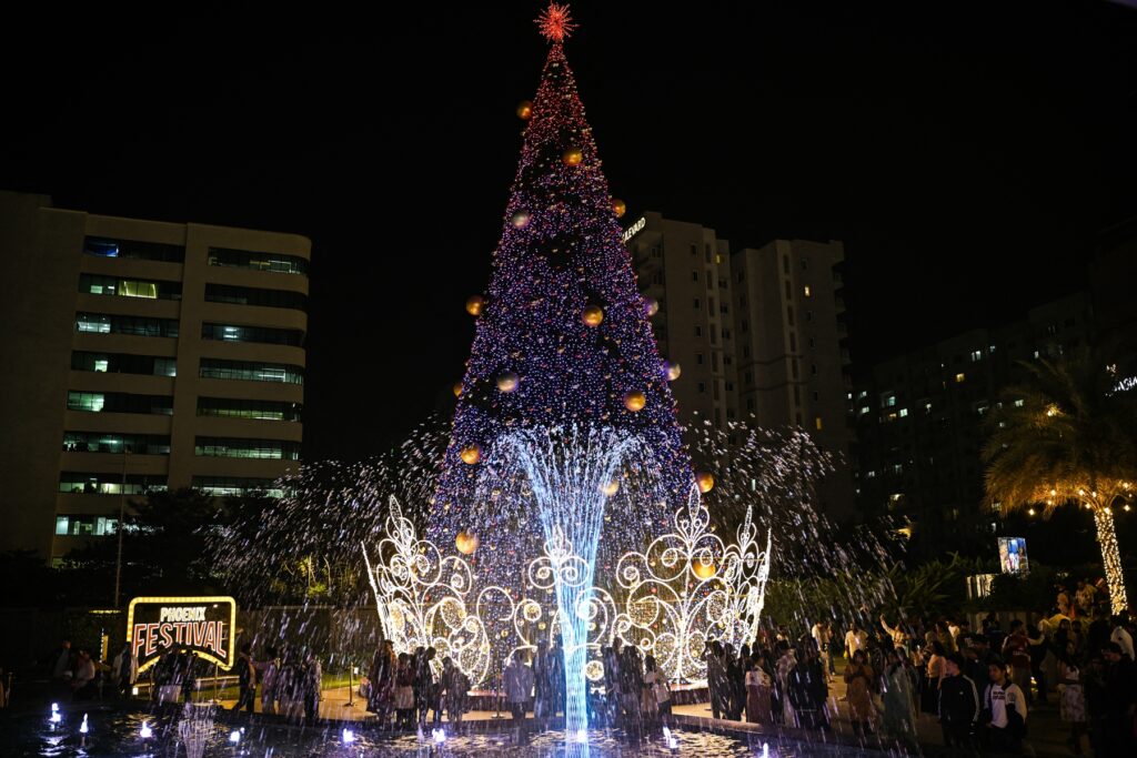 ライトアップされたクリスマスツリーの周りに集う人々。2025年12月23日、インド・ベンガルールのフェニックス・マーケットシティ。(Idrees Mohammed/AFP via Getty Images)
