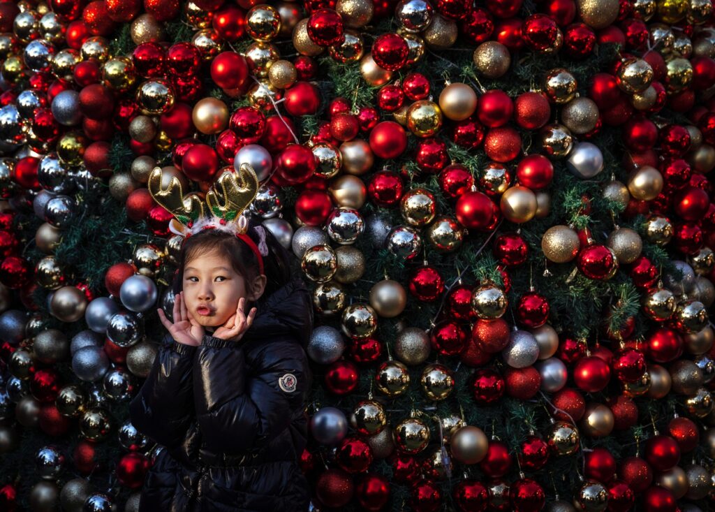 クリスマスツリーの前でポーズを取る少女。2025年12月21日、中国・北京のクリスマスマーケット。(Kevin Frayer/Getty Images)