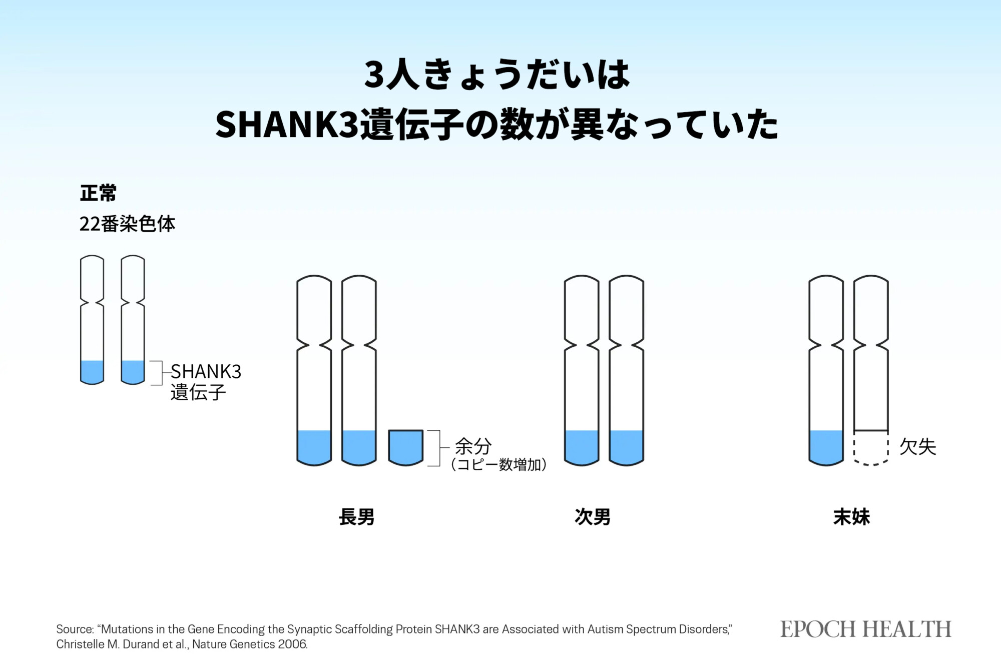 このきょうだいの行動の違いは、「SHANK3」遺伝子のコピー数の違いによるものでした。