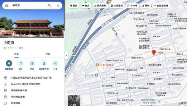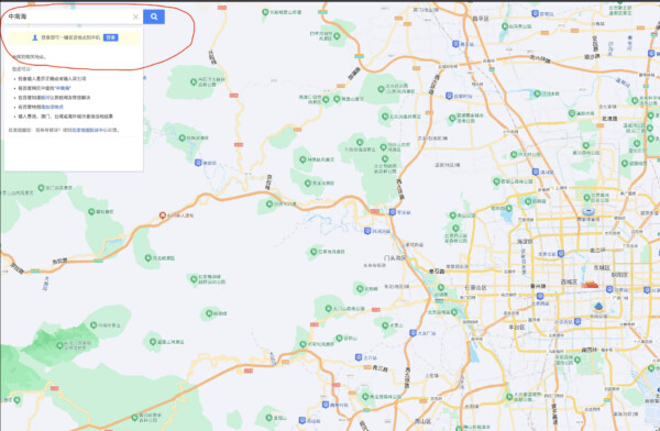 中国で広く使われている地図アプリで「中南海」と検索すると、「該当する地点はありません」と表示される。