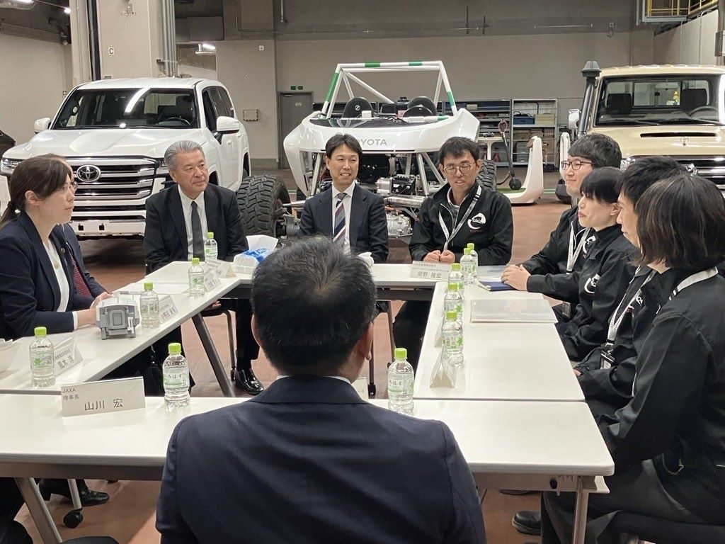 小野田大臣は同研究所において、有人与圧ローバの試作機に実際に試乗し、その操作性や機能を確認した。また、開発の最前線に立つ若手技術者を含む職員らとの意見交換の場が設けられた。