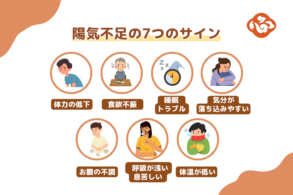 陽気が不足すると代謝機能が低下し、次のような症状が現れやすくなります。