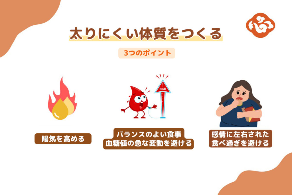 陽虚体質の人は、減量に成功してもリバウンドしやすい傾向があります。その理由として、代謝が遅いこと、血糖値の変動が大きくインスリンが過剰に分泌され脂肪がつきやすくなること、あるいはストレスによる過食などが挙げられます。