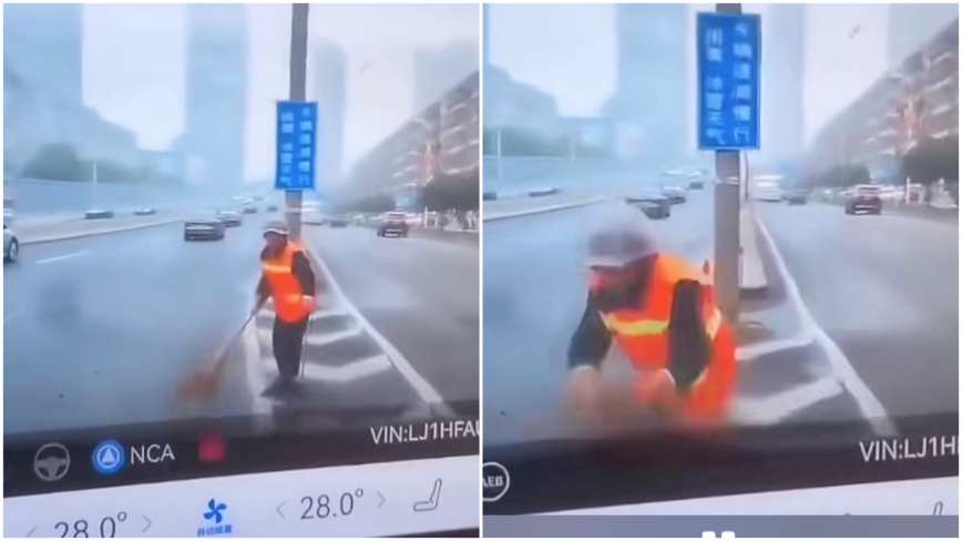 ネット上に出回っている映像では、車が交差点に差しかかる直前、突然右に進路を変え、白い斜線で囲まれたエリアであるゼブラゾーン(導流帯)に進入し、その中で作業していた清掃員に衝突する様子が確認できる。