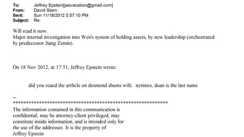 メールの中でエプスタインはスターンに対し、「沈棟(デズモンド・シャム)の妻に関するニューヨーク・タイムズの記事を見たか? 段という姓の女性だ」と問いかけている。