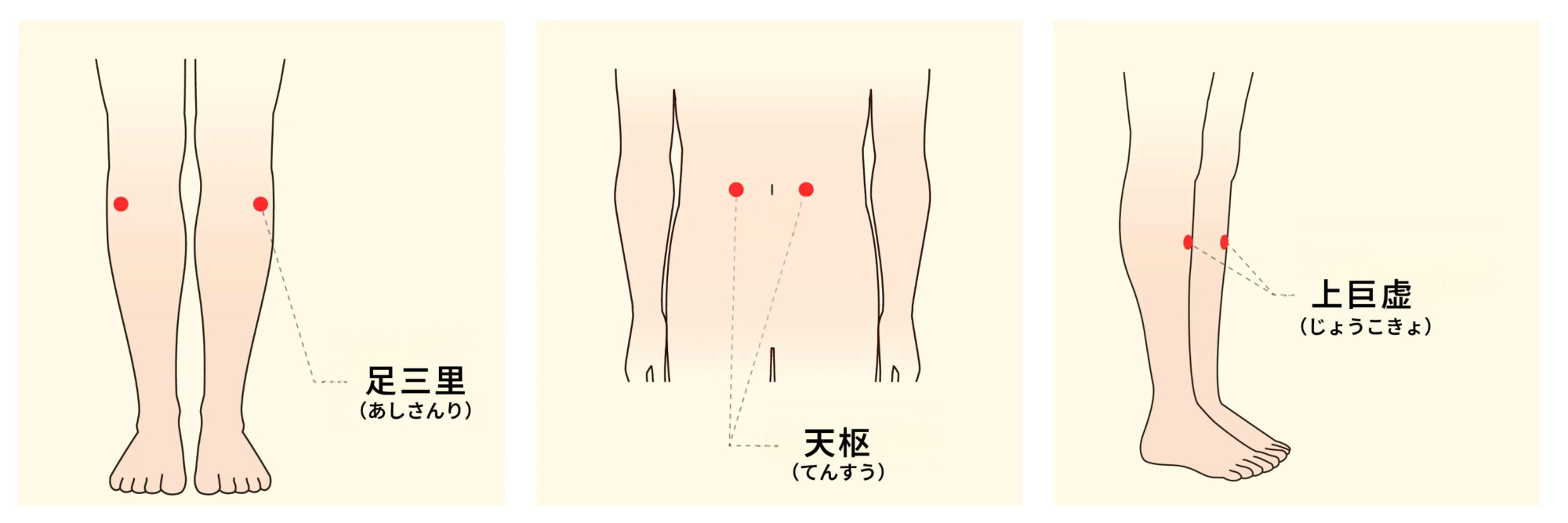 鍼灸は下痢への対応として用いられる方法の一つです。代表的なツボには「足三里」「上巨虚」「天枢」があり、これらは経絡上の要所として、体の各部位をつなぎ全体的な調和を支えるとされています。