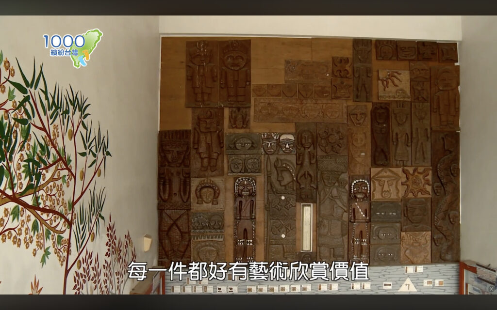 校門には瑠璃珠(リューリーズゥ)を模した門止め、灯篭が輝き、校舎の壁にはパイワン族の伝統故事の壁画があります。尊重·調和·幸福を表す黄·緑·赤の祈りの壁や、階段には子どもたちの彫刻作品がずらり!どれも芸術的で素敵です。
