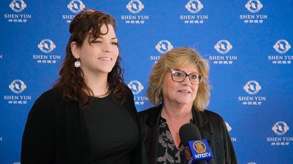 理学療法士のジリアン・ダイクスさん(左)は「本当に素晴らしかったです。実は母への誕生日プレゼントとして公演のチケットを購入しました」と語る。母親のホープさん(右)は「もう、素晴らしいの一言です! 衣装、メイク、芸術レベル、すべてが驚くほど見事でした」と感嘆した(新唐人テレビのスクリーンショット)