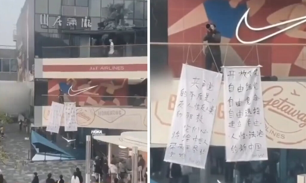 映像は2025年10月25日、北京市内の三里屯(さんりとん)の商業施設で撮影とされる。建物2階のバルコニーから、2枚の横断幕を掲げている。現場では拡声器のような音声で、「邪悪な体制を打倒せよ」といった内容の声も流れている。