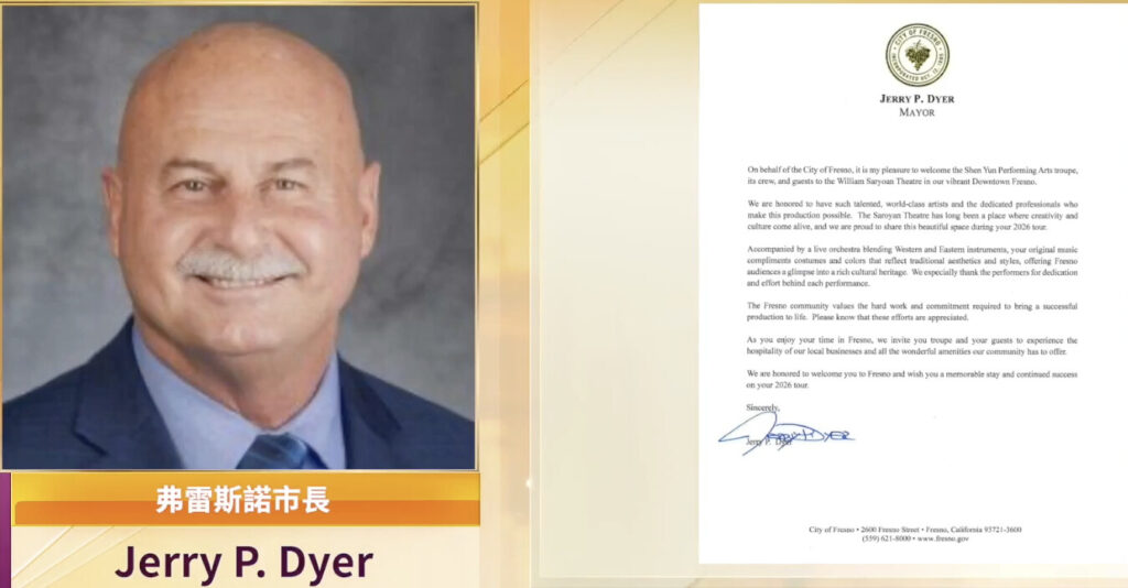 公演にはフレズノ市のジェリー・P・ダイヤー市長(写真:上)や近隣都市の政府要人からも祝賀状が届き、神韻芸術団の再来を歓迎し、公演の成功を祈る言葉が寄せられた。