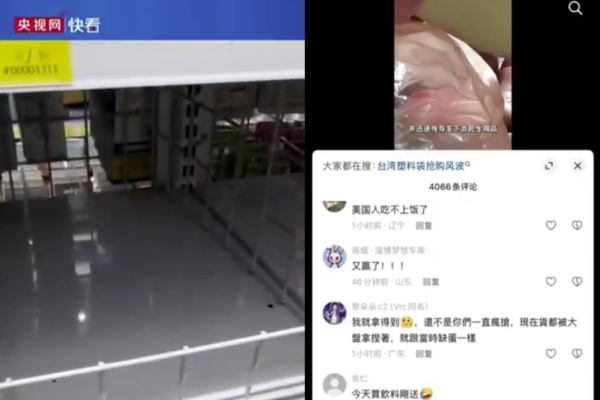4月2日、国営中央テレビ(CCTV)は、空の棚の映像とともに「中東情勢の影響で供給網が混乱し、台湾でレジ袋やゴミ袋が不足し、金があっても買えない状態」と報じた。