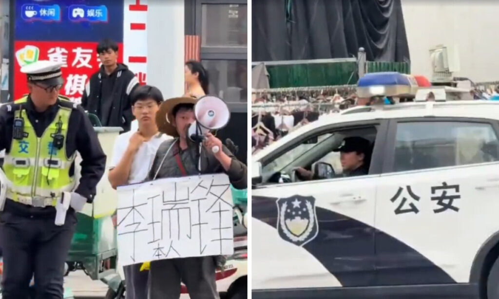 左:街中で拡声器を使い日本を批判する内容を叫んでいた男 右:現場に駆けつけた公安の車両、2026年4月6日、中国・鄭州市(動画よりスクリーンショット)