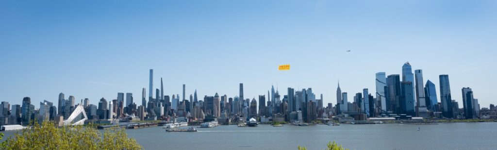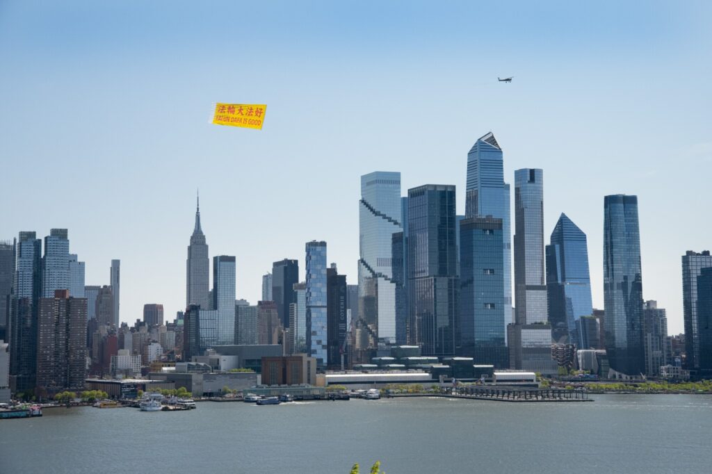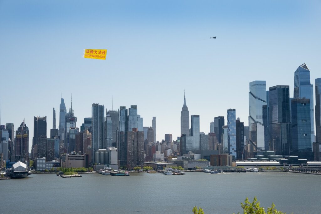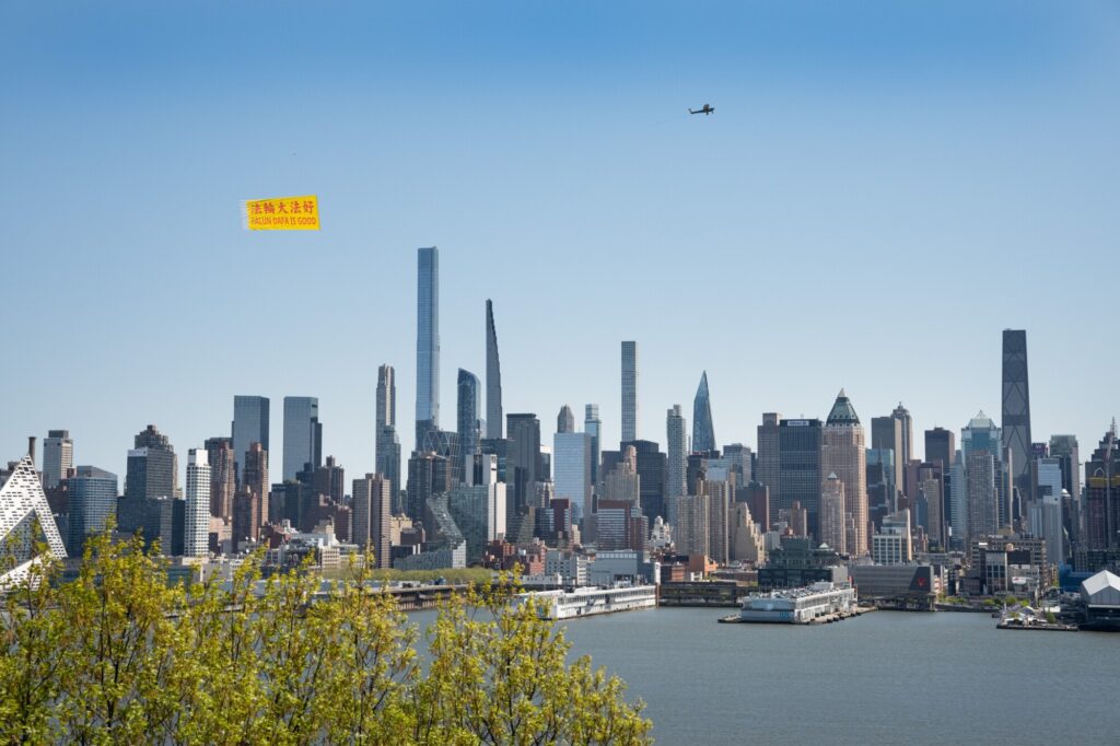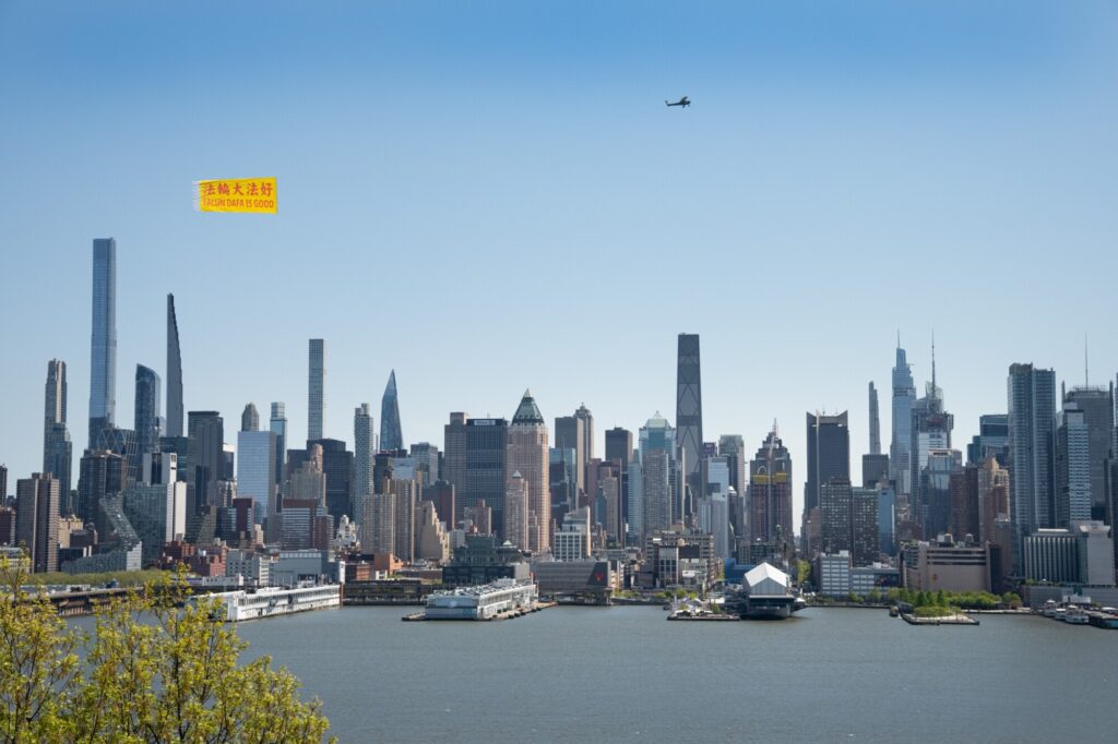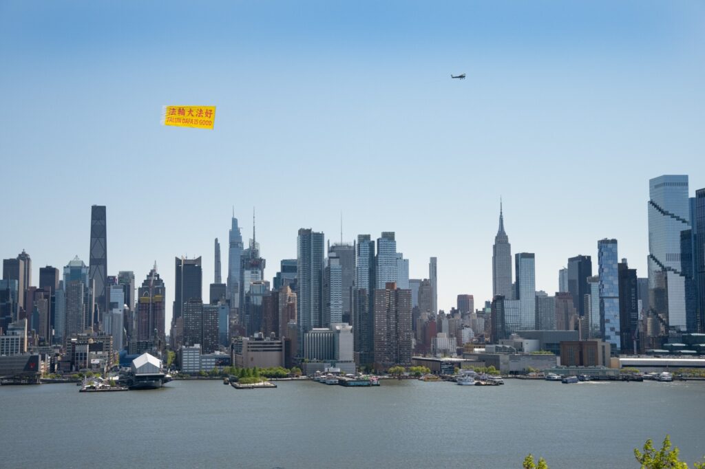 今月24日(現地時間)、米ニューヨークのハドソン川上空で、小型機が「法輪大法好(FALUN DAFA IS GOOD)」と記した大型の横断幕を掲げて飛行した。中国の法輪功学習者による1999年の「4・25」平和的な陳情から27年を迎えるのを記念するため、世界有数の都市景観として知られるマンハッタンの空に、鮮やかな文字が浮かび上がった。