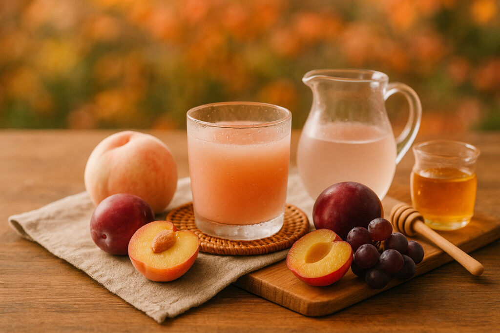 桃とすももを組み合わせた初秋の養生ジュース。肺を潤し、気血を補い、残暑で消耗した体をやさしく修復します。
